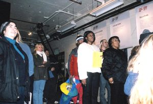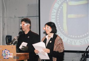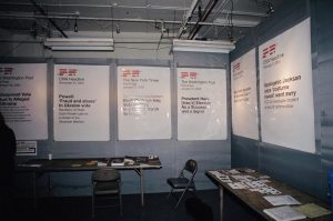 In October 2005, 60 artists collaborated as the Freedom Fries Art Collective to create what we called "The Opening Act: Dissent is Democracy"—an immersive multi-media art installation-as-protest to what we saw as the threat to our nation's democracy. More than 1000 people attended the event over the weekend of City Wide Open Studios. As the decline of democracy has recently taken a further plunge, we are contemplating our next act… Above is the sizzle reel from The Opening Act and below are a few of the graphics and photos from the event. And… please let us know if you'd like to be involved in our next project. Visitors entering the exhibit were given rose-colored glasses.