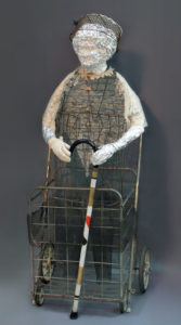 Grandma Lil’s cart, her cane (hand painted by Sharon in the 80’s), fry basket, aluminum foil, wire, mesh screening, lace, fabric 57"h X 24"d X 24"w