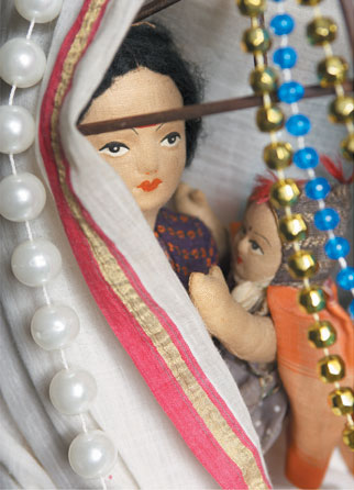 Me in Sri Lanka, Easel, fabric, paper, hat, beads, toys and dolls