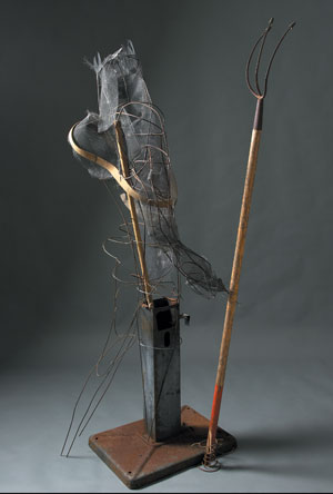 Milo (2nd Millennium Man) Wire, tomato cages, WW1 Belt, screening, wood, tools, junk 605"h X40"d X 26"w