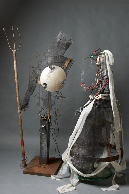 Milo & Millie (2nd Millennium Man & Woman) Life-sized Mixed-media Wire, tomato cages, grill cages, screening, WW1 Belt, wood, tools, lace, fabric, junk 605"h X40"d X 26"w